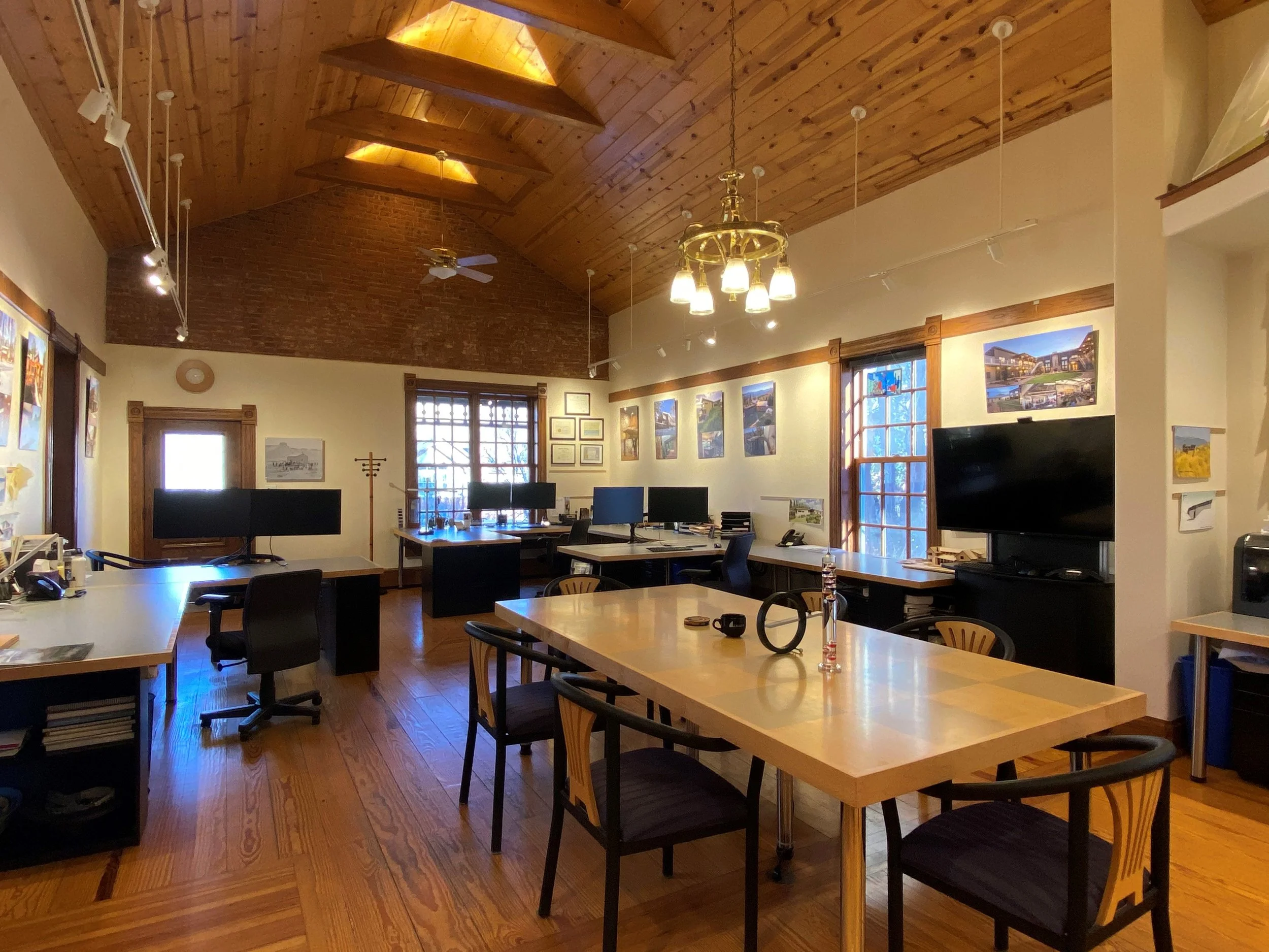 • Designated as an historic landmark, Colorado’s oldest remaining schoolhouse had been used as a residence for more than a century when it suffered catastrophic damage from a fire, requiring new floor and roof structure.  Ewers Architecture resculpted the space as our office, along with a two-bedroom residence attached to the rear.  No walls (other than the toilet and storage closet) reflects the way we run the office, with everyone involved in every projects and no room for secrets.  The building not only provides a beautiful space to spark our creativity, it also has provided a laboratory for trying new systems and materials, such as lighting (2018 and 2025), new exterior colors (2019), roof-mounted solar photovoltaics (2019), heat pump water heater (2019), air source heat pump heating and cooling (2021), lighting controls (2021), ergonomic seating (2000 and 2021), sit/stand desks (2024), and low-water landscaping (ongoing).  Stop by and visit our laboratory.